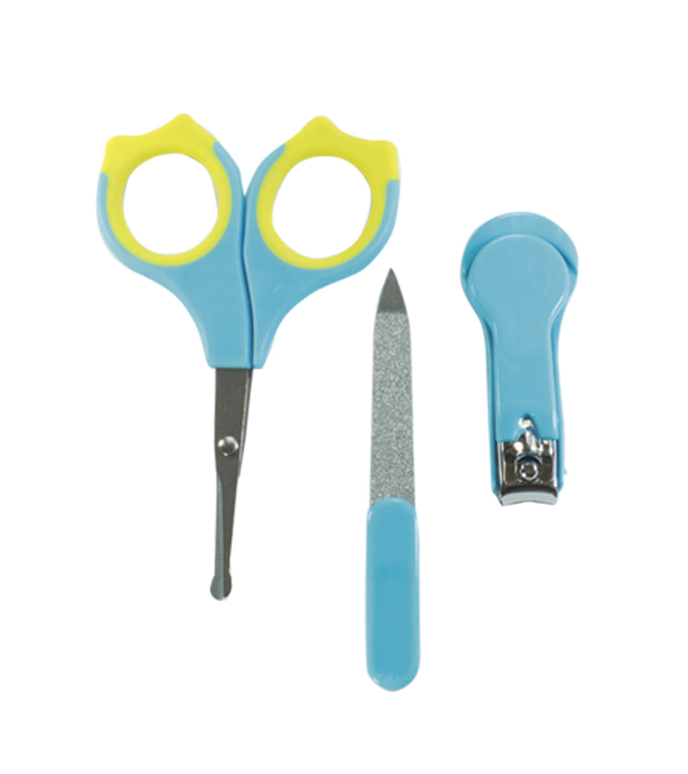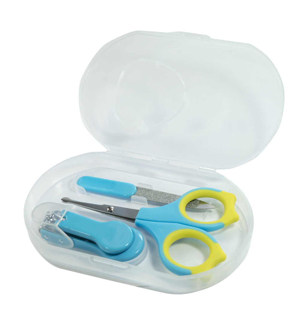 Tijera de uñas: De punta redonda para seguridad y facilidad de uso. Manillas grandes para manipulación del adulto.
